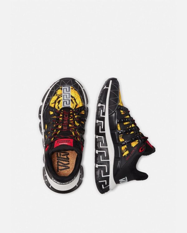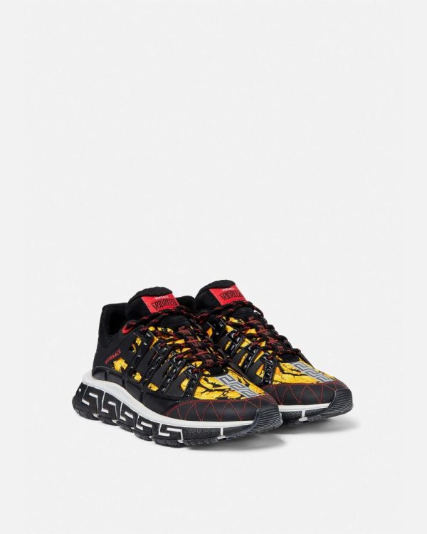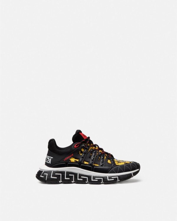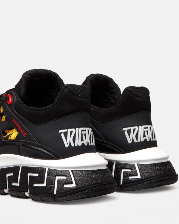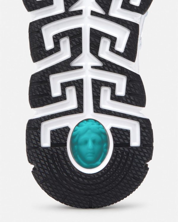 The Trigreca trainers bring innovation to the brand’s ever-evolving aesthetic. Three-dimensional Greca executions on the soles offer an impactful landing with the “Greca Cushioning System.” In a subtle nod to Versace’s home city, the uppers have a discrete print of Milan’s coordinates.