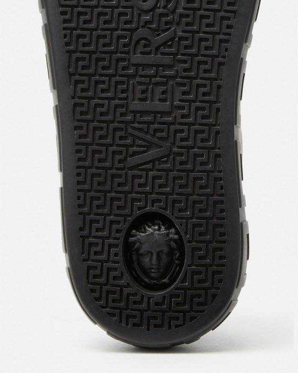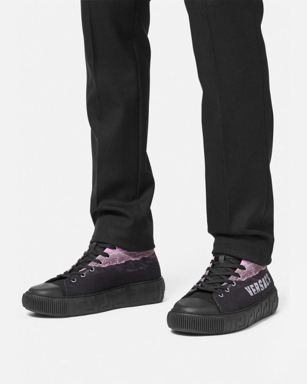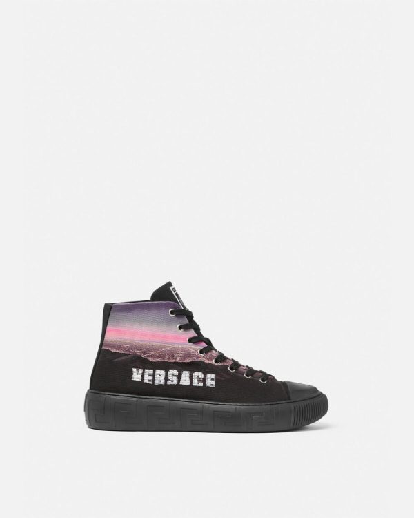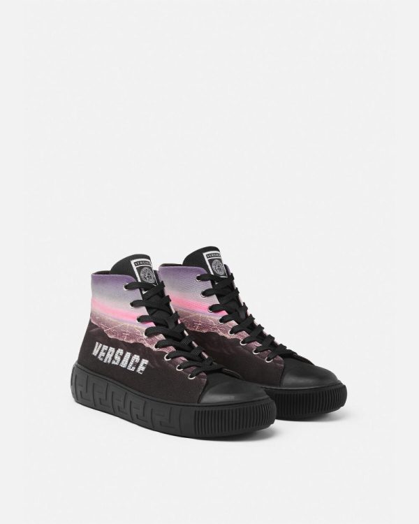 The high-top silhouette is characterised by an engraved Greca pattern on vulcanised rubber soles, featuring uppers in a graphic print representative of the modernity and glamour of Hollywood, with a Versace twist.
