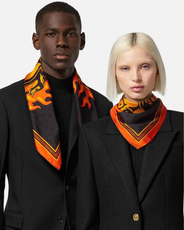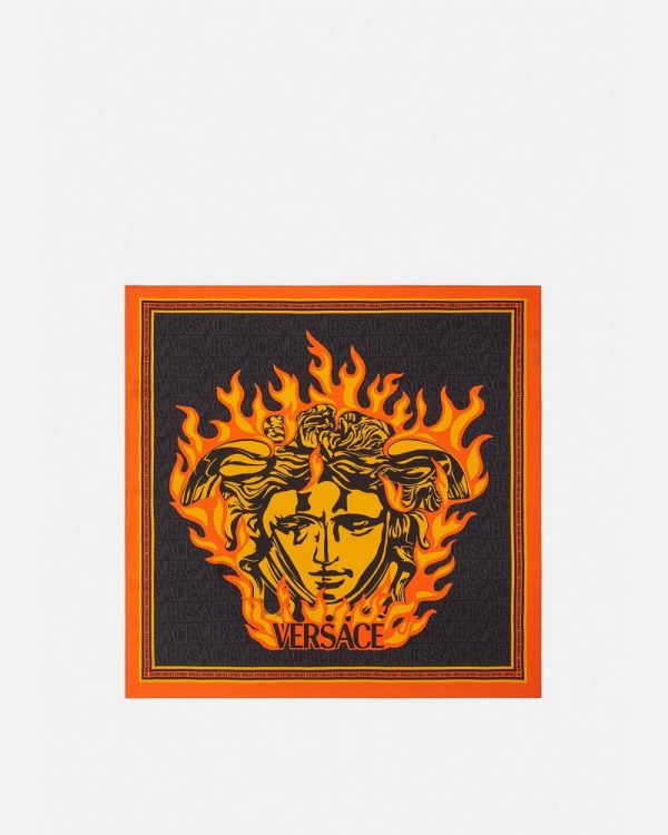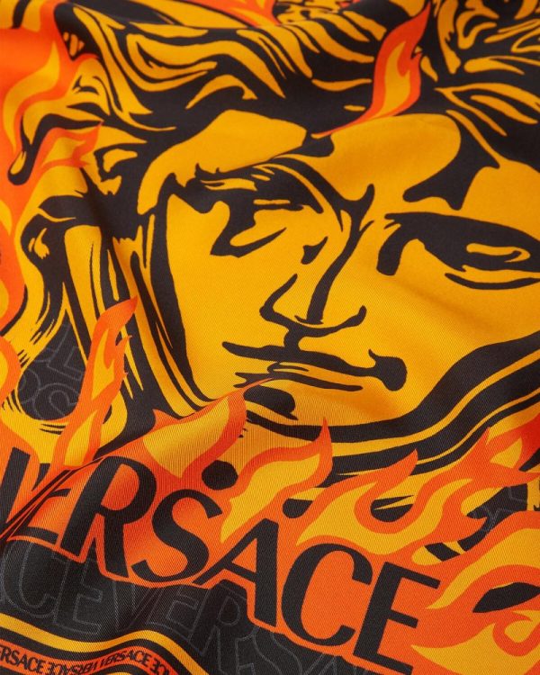 Silk foulard featuring a Medusa Flame motif with a Versace Allover print background.