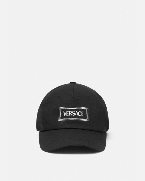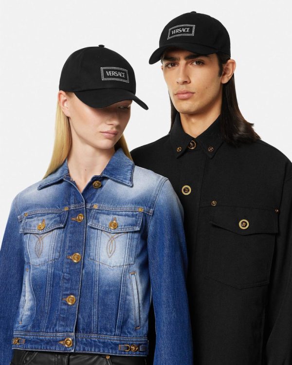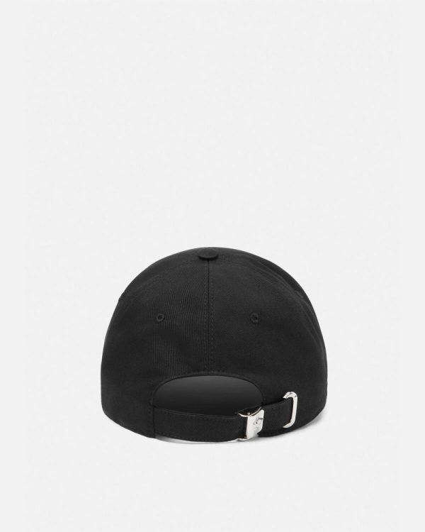 This canvas baseball cap features an embroidered Versace logo at the front and an adjustable strap with Medusa hardware.