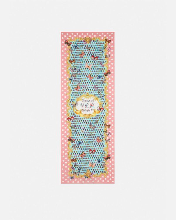 This silk scarf features a refreshed archival print from the ’90s featuring butterflies and ladybugs against a polka dot background and Baroque flourishes.