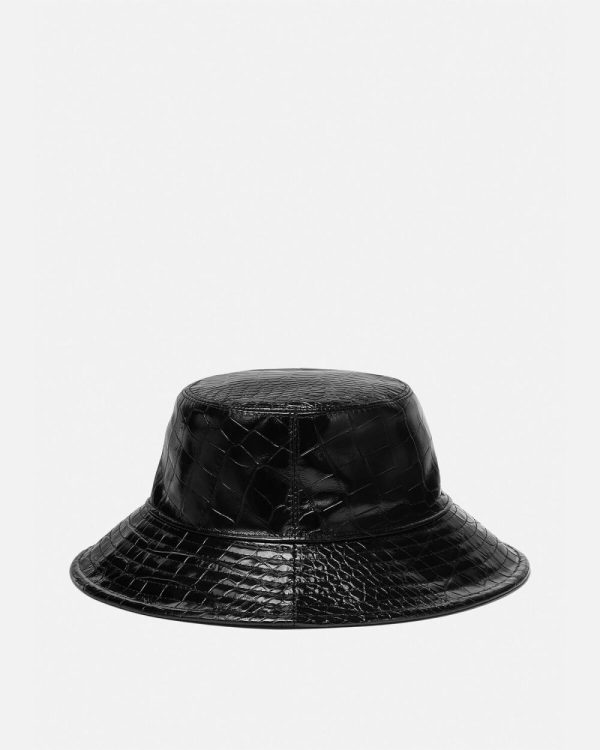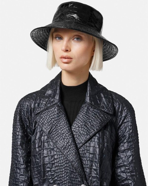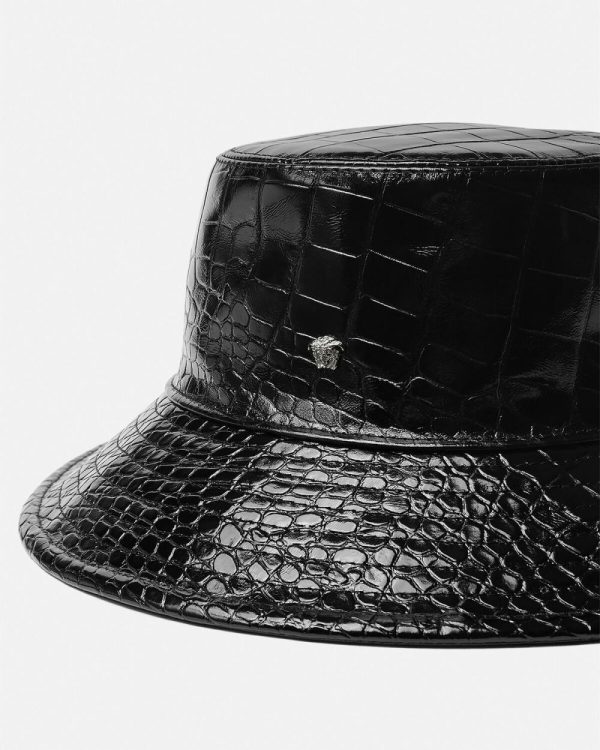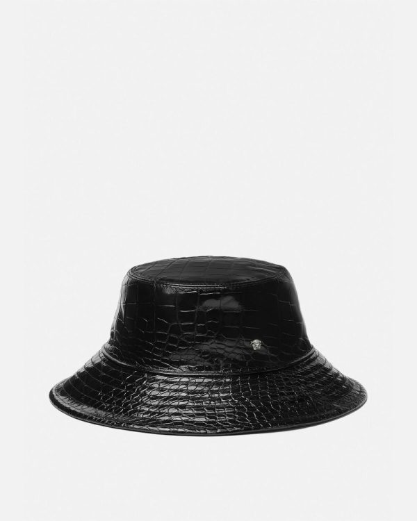 A bucket hat crafted from croc-effect embossed leather featuring a Medusa stud and a wide brim.