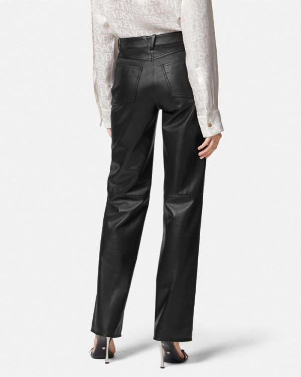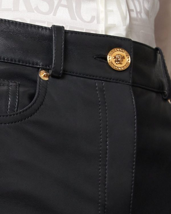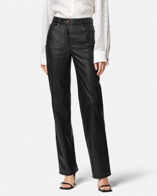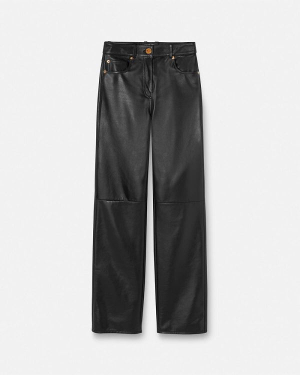 Straight-leg leather trousers accented by Medusa hardware in a five-pocket design.