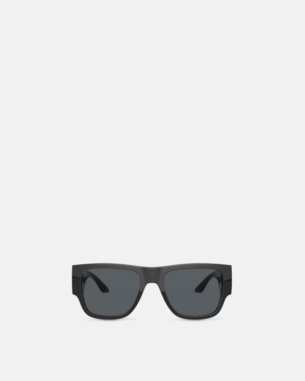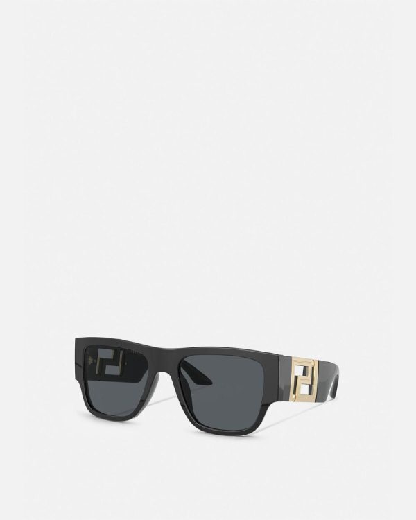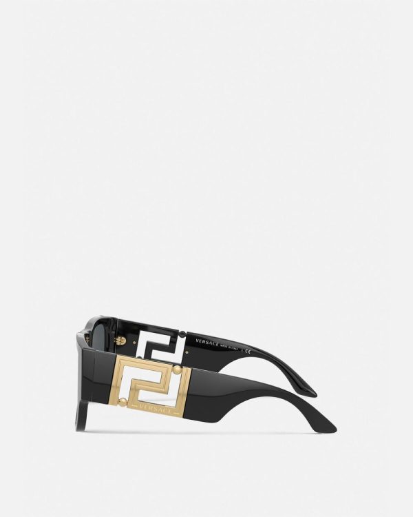 A sleek runway style, these rectangular sunglasses are the ultimate bold accessory. The new design is characterized by ultra-wide temples enriched with geometric Greca hardware in a glossy, golden finish. This style features a black frame and temples paired with dark grey lenses.