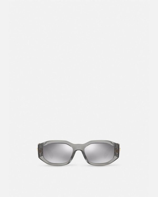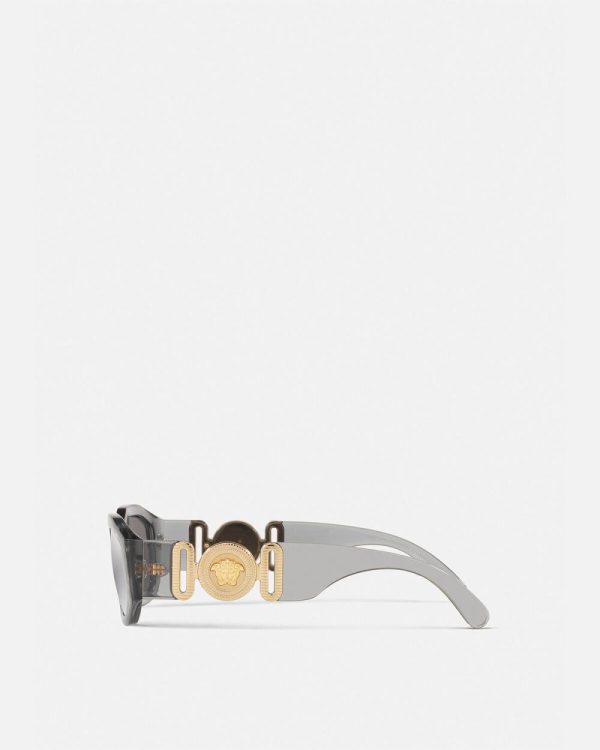 Sunglasses that evoke the opulent style of a hip-hop icon with a bold low-lens shape and wide temples embellished by a gold-tone heritage Medusa medallion. In a contemporary combination of a thick grey frame and silver mirrored lenses.