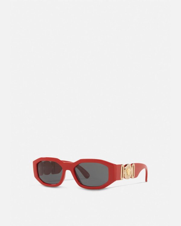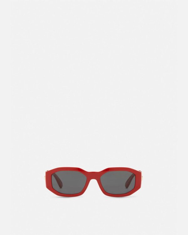 Refreshed in a zesty tone tone, these classic sunglasses evoke the opulent style of a hip-hop icon with a bold low-lens shape and wide temples embellished by a gold-tone heritage Medusa medallion. Featuring a bold combination of a red frame and grey lenses.
