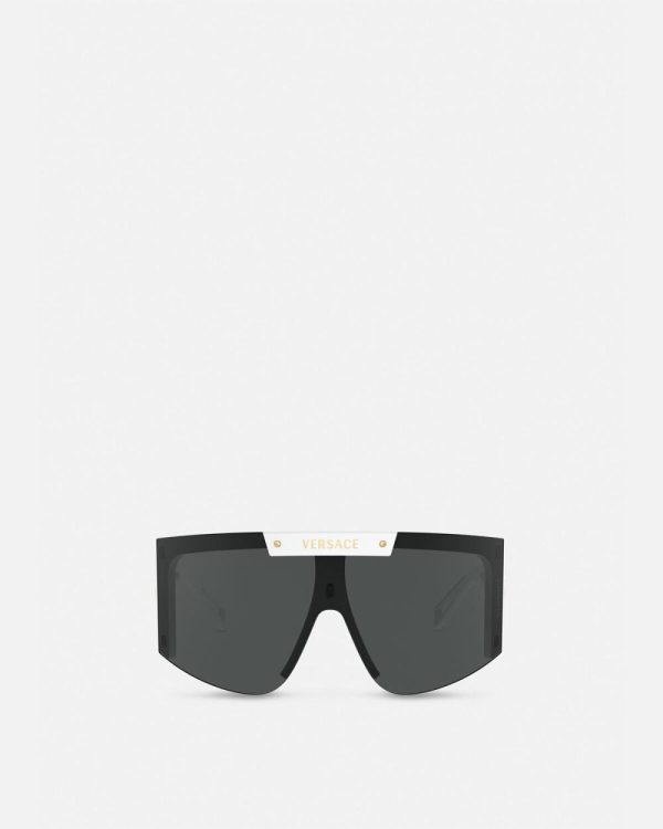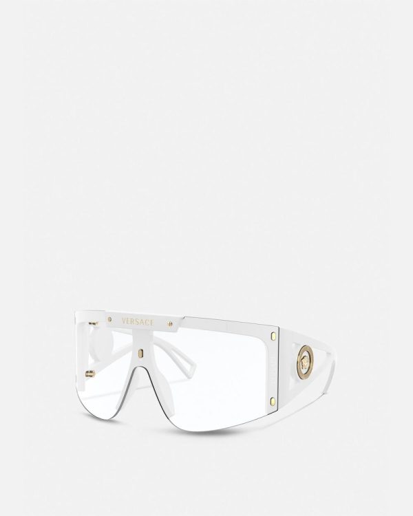 Seen on the runway, this wrapped semi-rim shield style features wide and hollow tapered temples in a bold white hue. The frame features a gold-tone logo, while the temples are enriched with a signature Medusa emblem. The statement style features three sets of lenses – in a classic grey tone, transparent, and a gradient petrol to yellow scale.