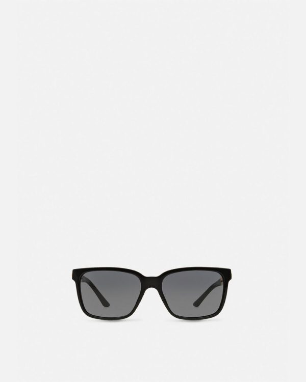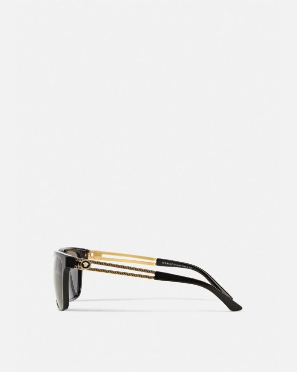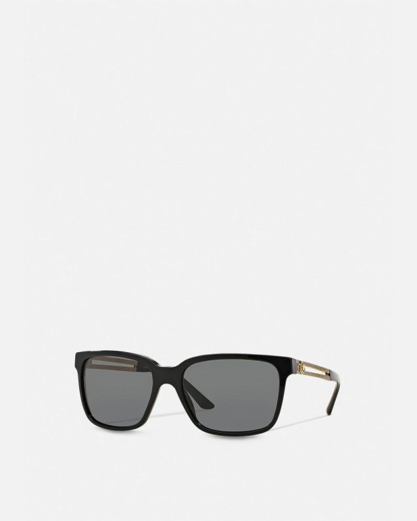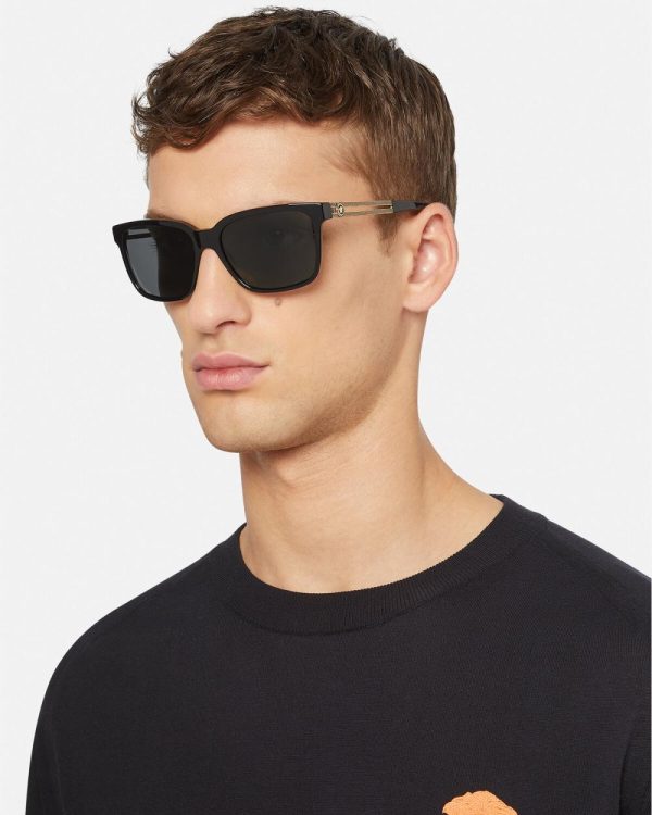 Black acetate rectangular sunglasses with gold metal temple engraved with micro Greca and Medusa Head motif.