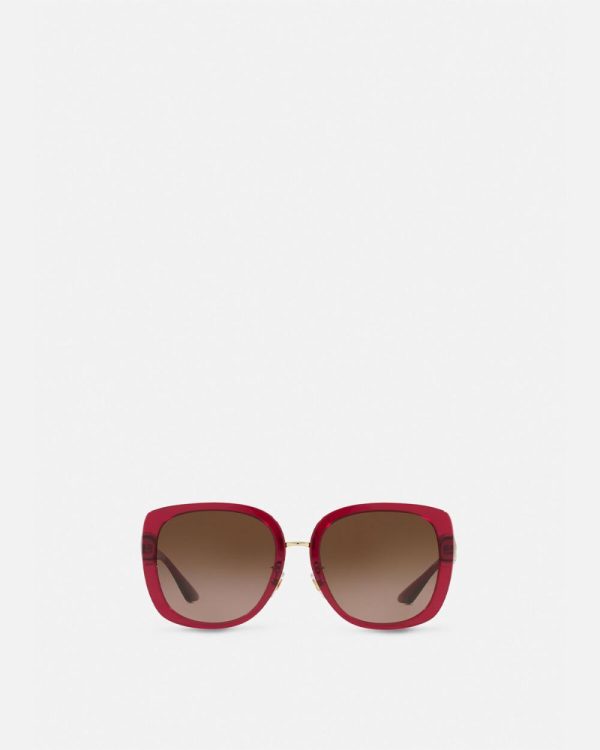 Easily recognizable by gleaming gold-toned Greca details at the temples, these rectangular sunglasses channel signature Versace glamour. The statement pair feature a transparent pink frame and gradient brown lenses.