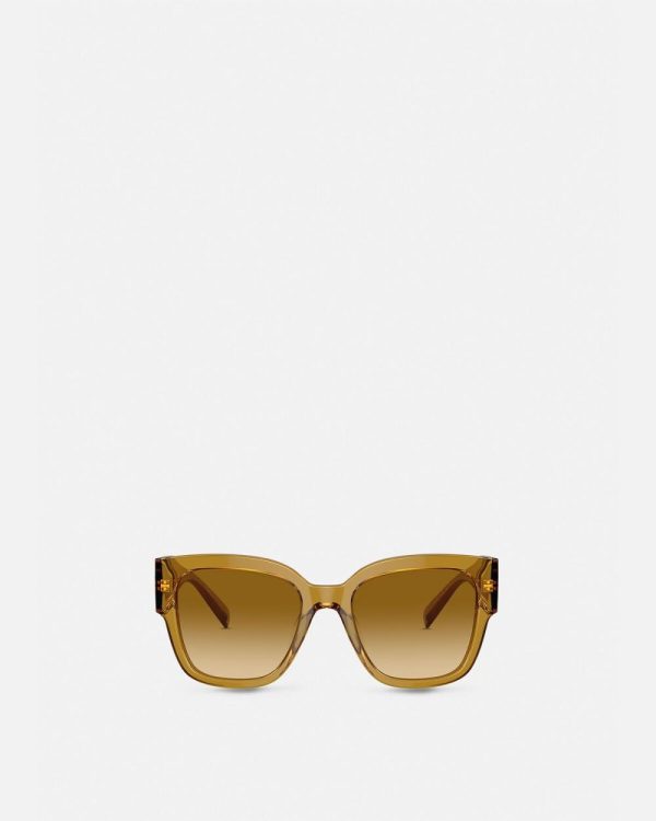 In a thick acetate, aviator shape, these sunglasses are accented by a Medusa emblem at the side.