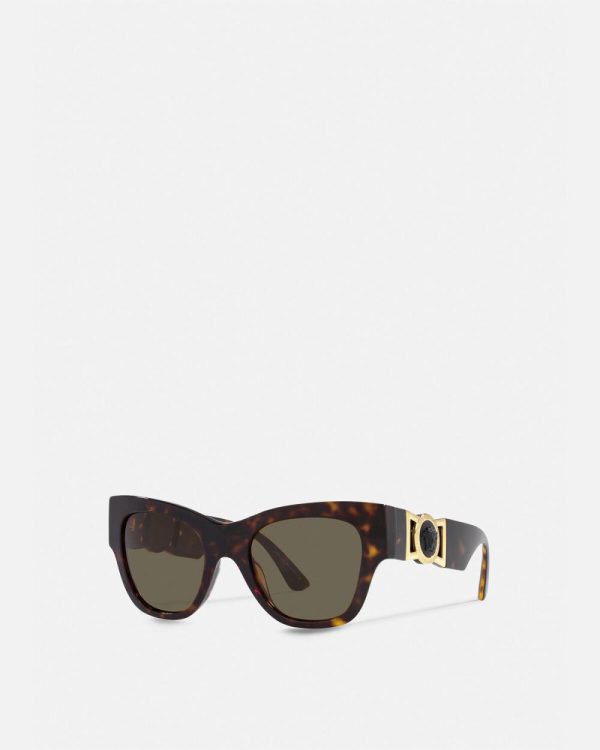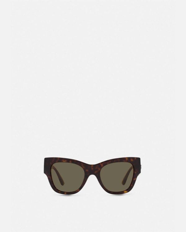 Inspired by ’90s hip-hop culture, these butterfly-shaped square sunglasses have tortoiseshell acetate frames and wide, Medusa-embellished temples.