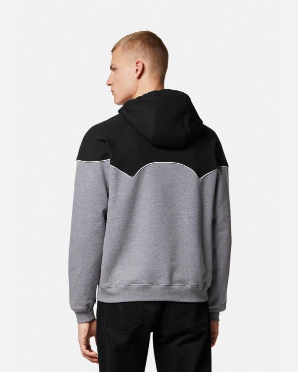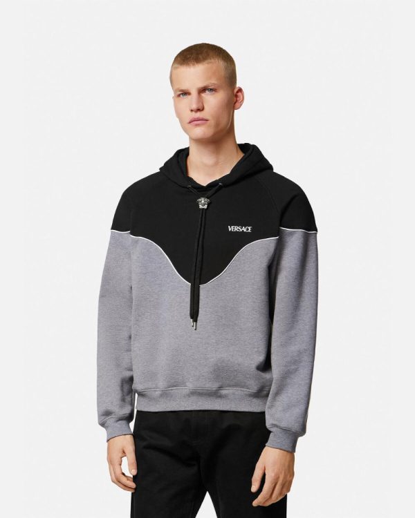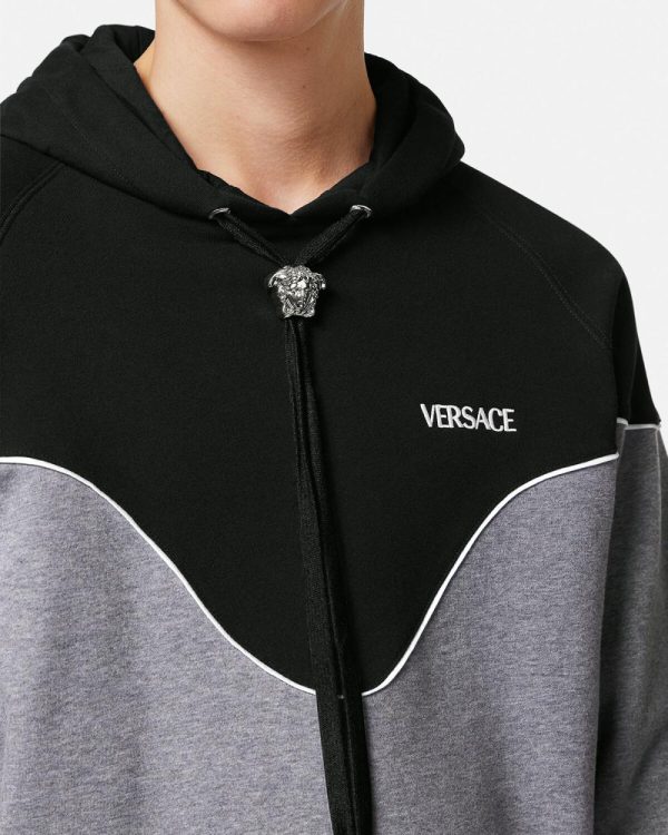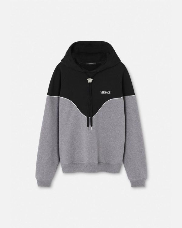 A regular fit hooded sweatshirt made from cotton jersey with a soft brushed fleece lining, featuring a paneled design with contrast piping, an embroidered logo at the chest, and a movable Medusa drawstring hardware.