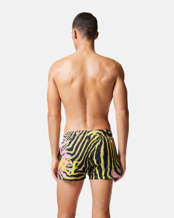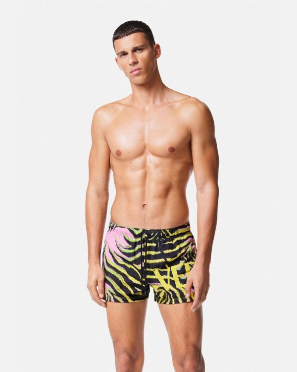 These swim shorts have an elasticated drawstring waistband and feature the Tiger print and a Versace logo on the side. For hygene purposes we advise to try on this item with personal underwear underneath.
