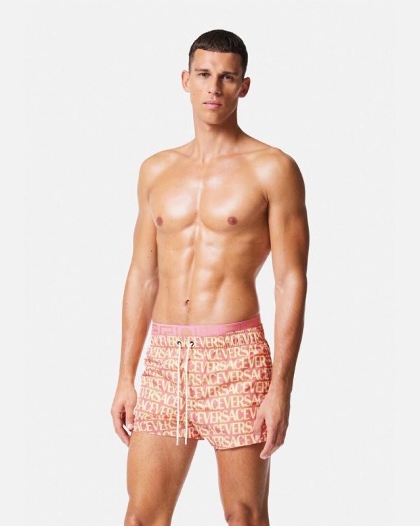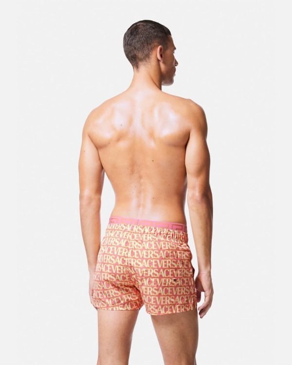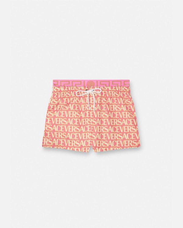 These swim shorts feature a Greca border waistband in a mock layered design and the Versace Allover print. For hygiene purposes we advise to try on this item with personal underwear underneath.