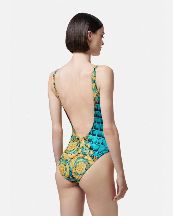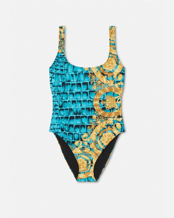 This one-piece swimsuit features an all-over Baroccodile print with a Medusa detail at the back. For hygiene purposes we advise to maintain the adhesive protective slip while trying on this item.