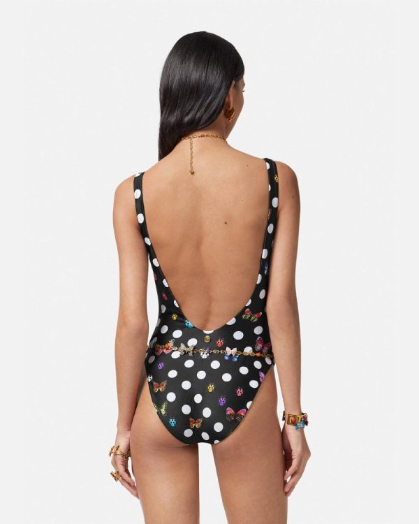 This polka dot one-piece swimsuit features a butterflies and ladybugs print with Medusa hardware. The beachwear style has a round neckline and a low back. Dua Lipa x Versace is a capsule of styles designed in collaboration with Dua Lipa and presented on the runway in Cannes.