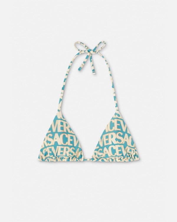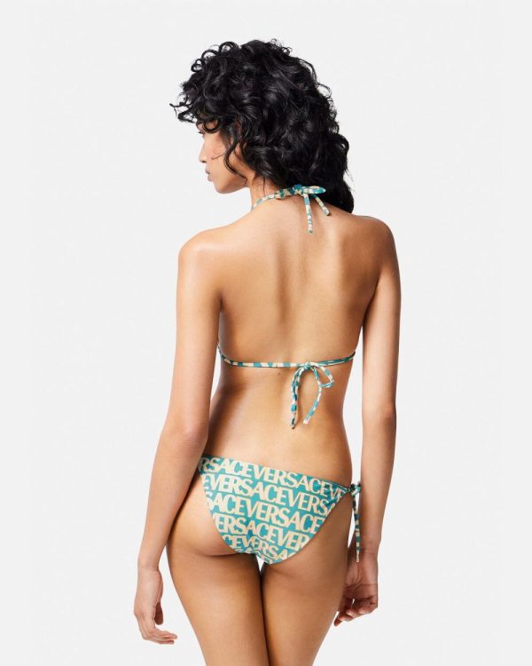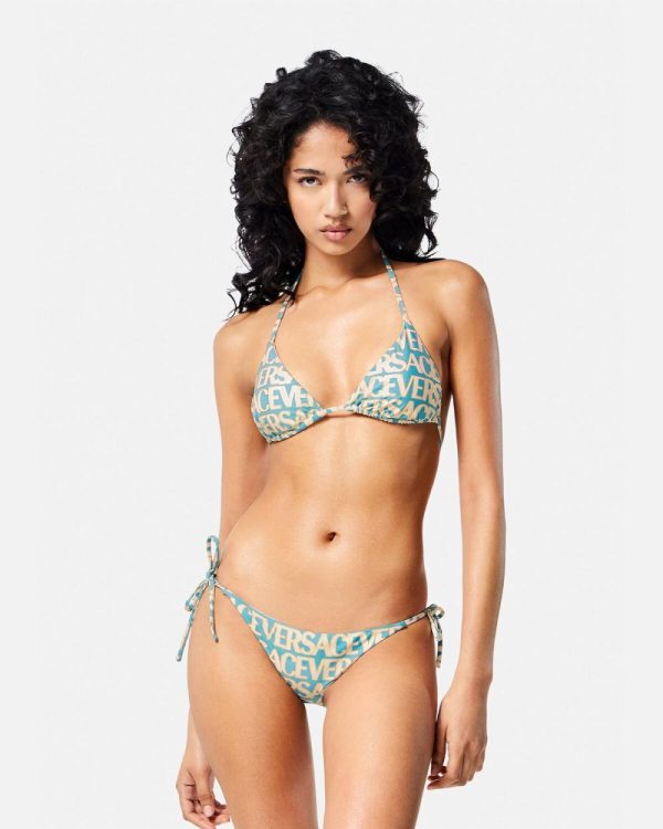 This triangle bikini top features the Versace Allover logo with a metallic outline. The beachwear style can be worn with matching bikini bottoms.