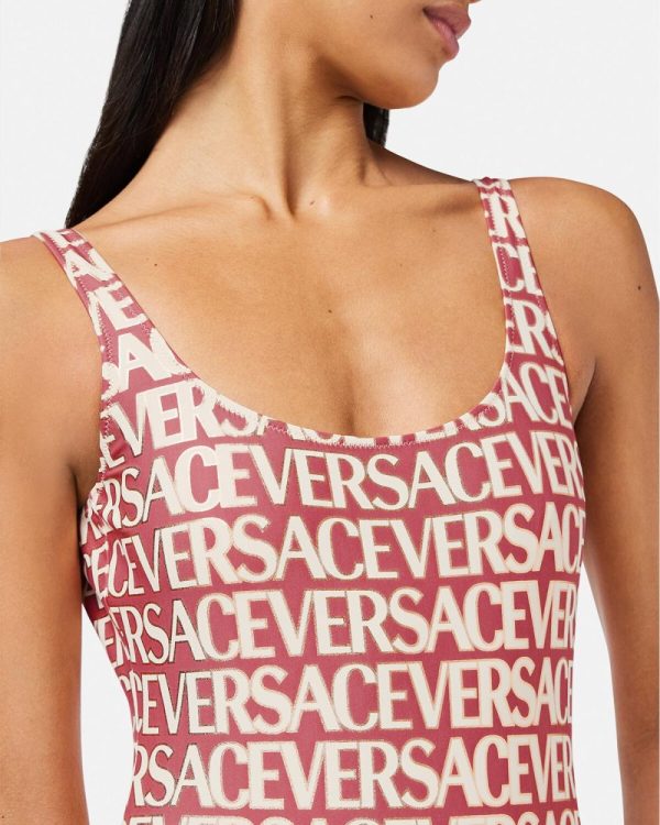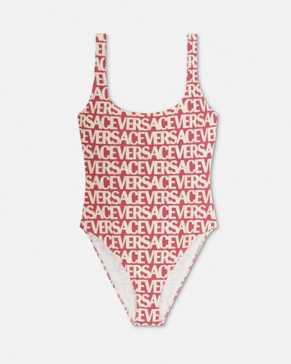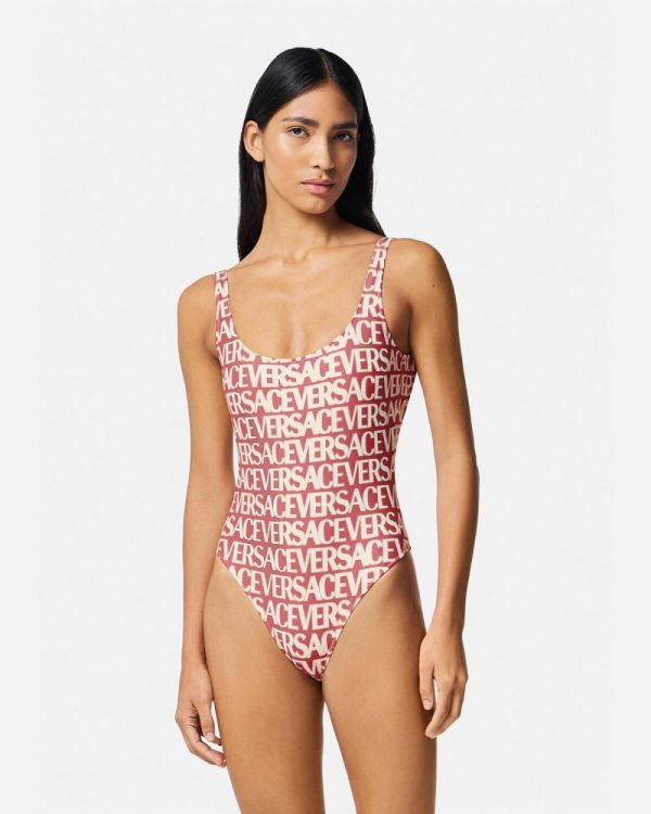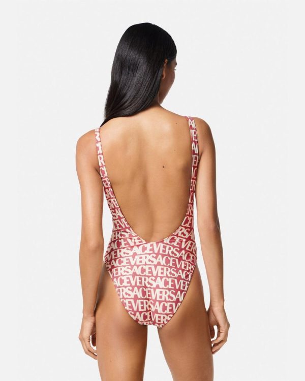 This one-piece swimsuit features a metallic outlined Versace Allover logo print and low back. For hygiene purposes we advise to maintain the adhesive protective slip while trying on this item.