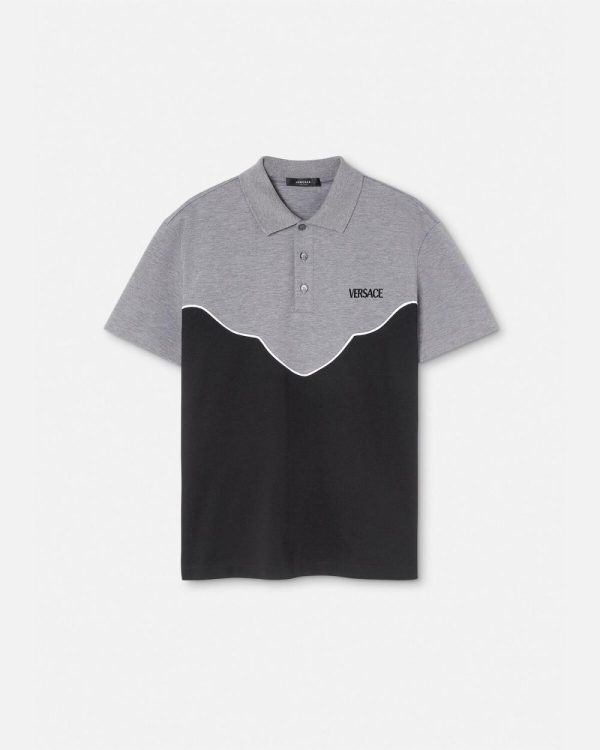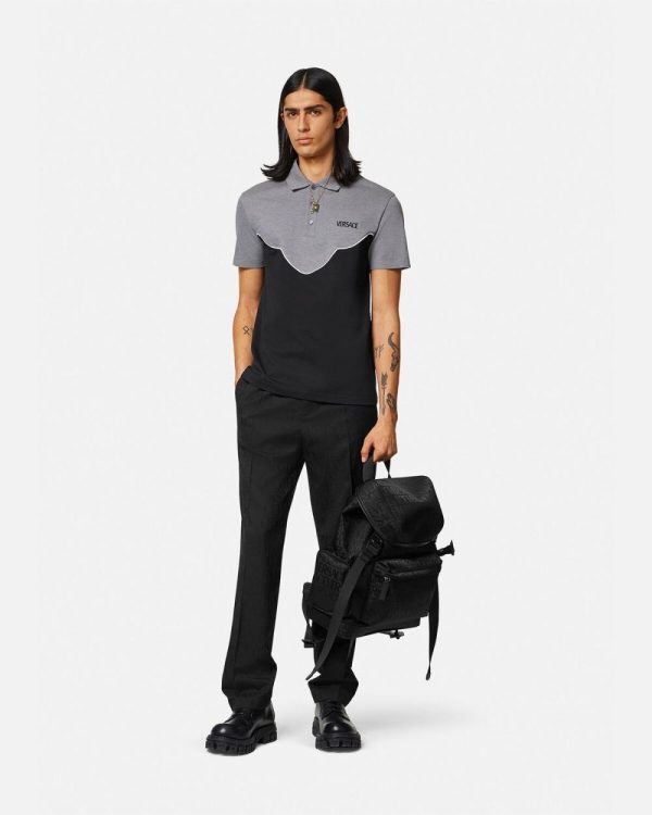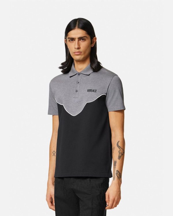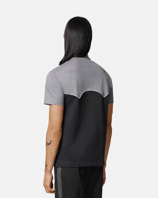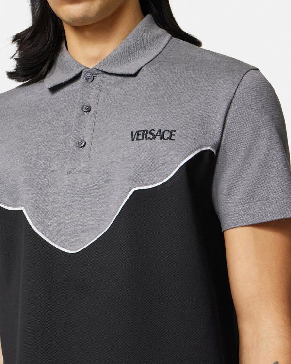 This short-sleeved polo shirt is made from cotton piquè featuring a Versace logo embroidery at the chest and a three-button placket. The design has contrasting panels and piping.