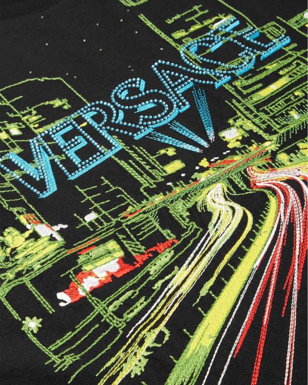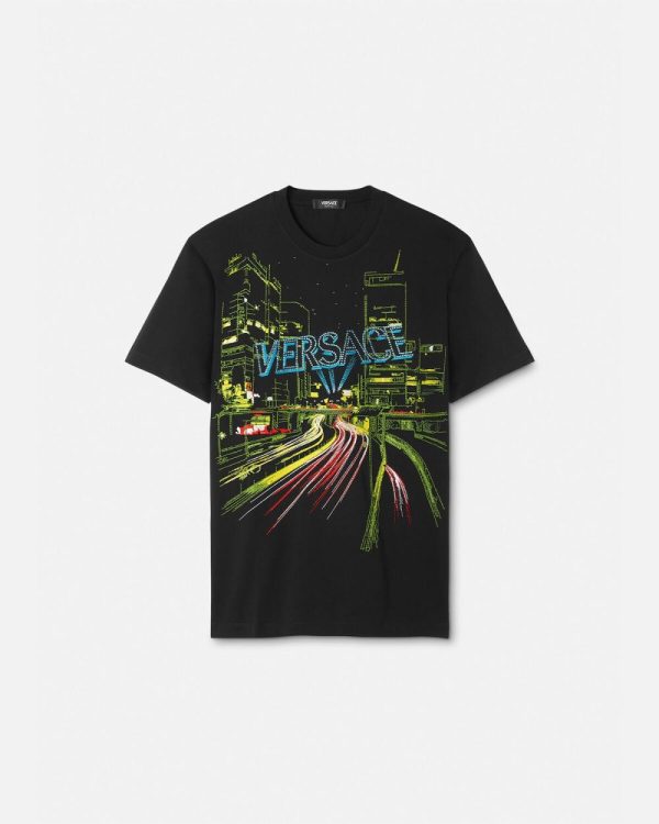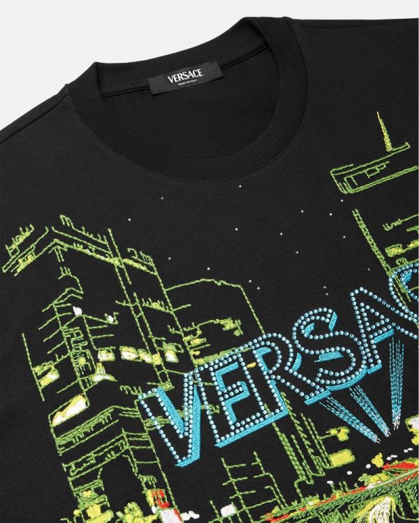 A short-sleeved cotton jersey T-shirt featuring a placement Versace City Lights embroidery.
