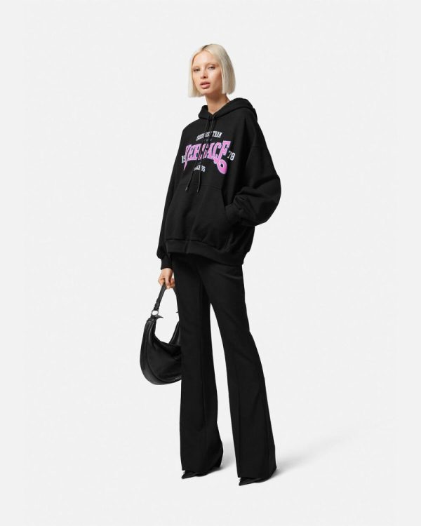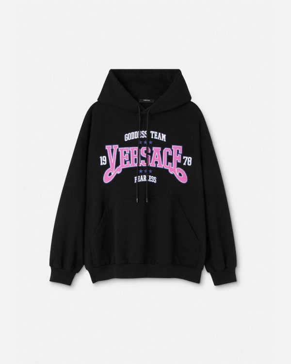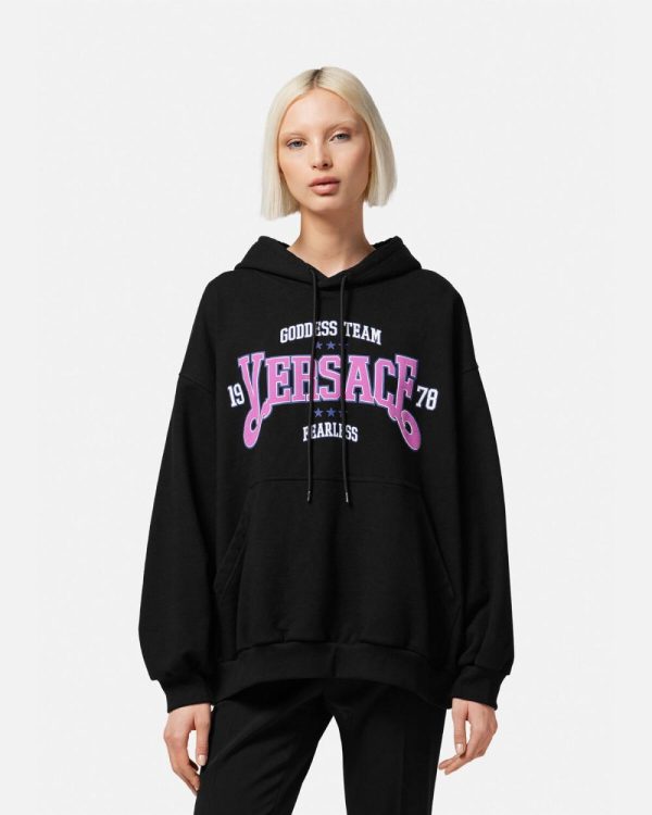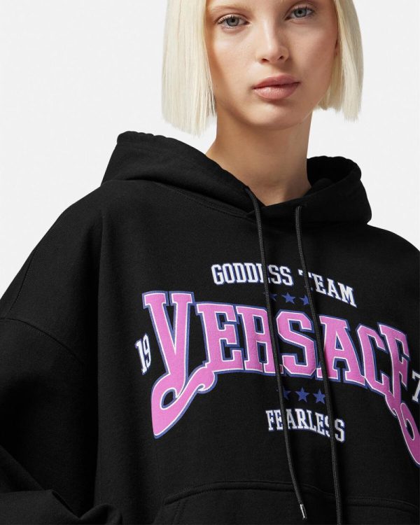 This cotton jersey hooded sweatshirt features a varsity-inspired Versace logo with a “Goddess Team” and “Fearless” slogan.