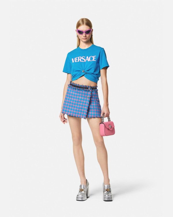 This cropped short-sleeved T-shirt features the Versace logo across the chest in a rubber finish. The style has a gathered hemline and statement Safety Pin hardware.