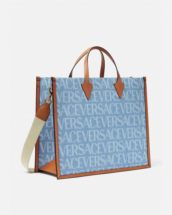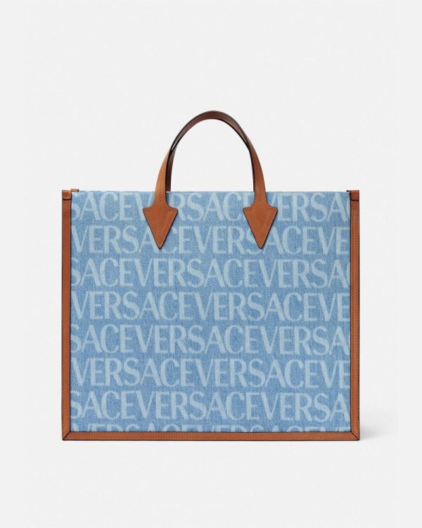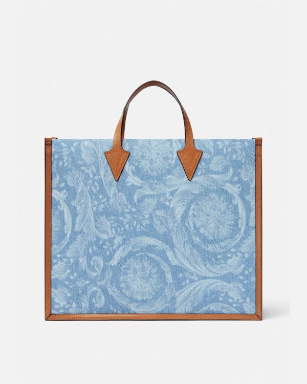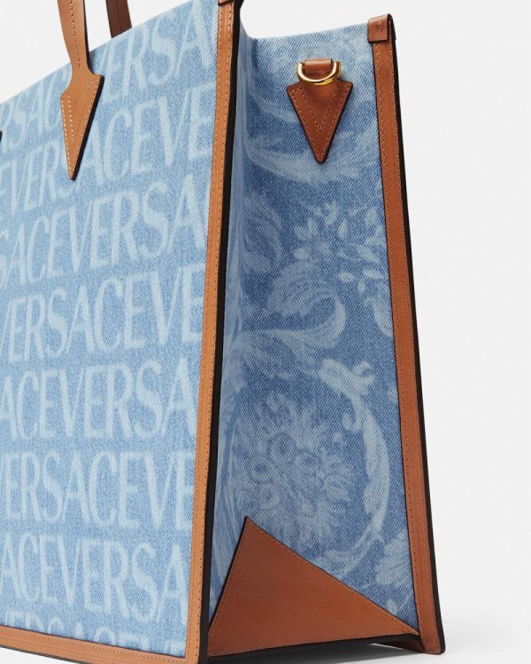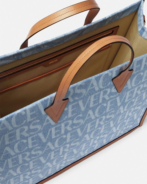 A spacious tote bag made from lasered denim panels in the Versace Allover and Barocco Silhouette pattern with leather trims. The open-top style is finished with leather handles and an adjustable and removable shoulder strap.