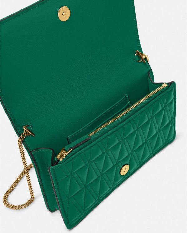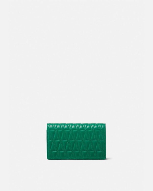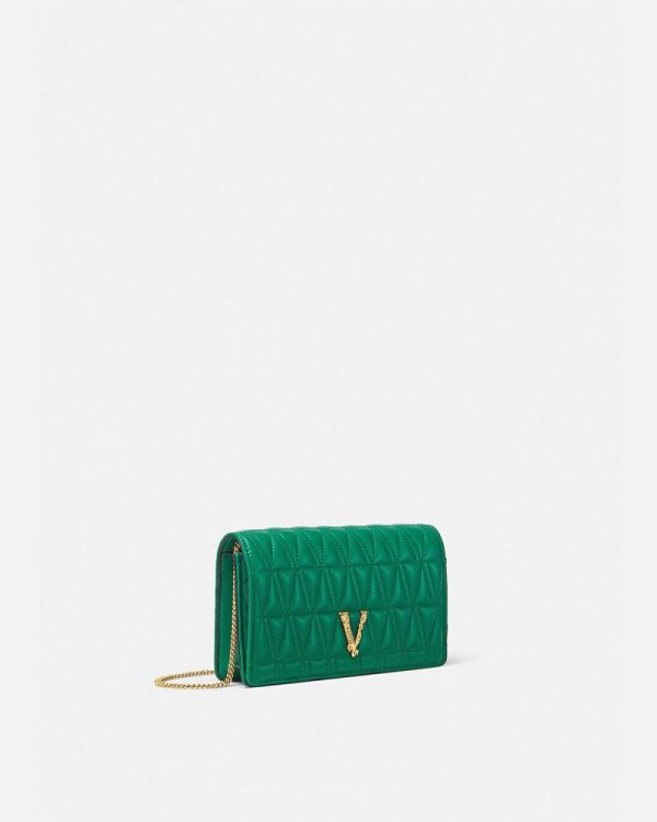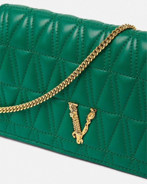 Crafted from leather in a quilted V-pattern, the Virtus clutch features a Barocco V with engraved acanthus leaf detailing and magnetic flap closure. The small evening bag can be hand-held or suspended from a thin, detachable chain.