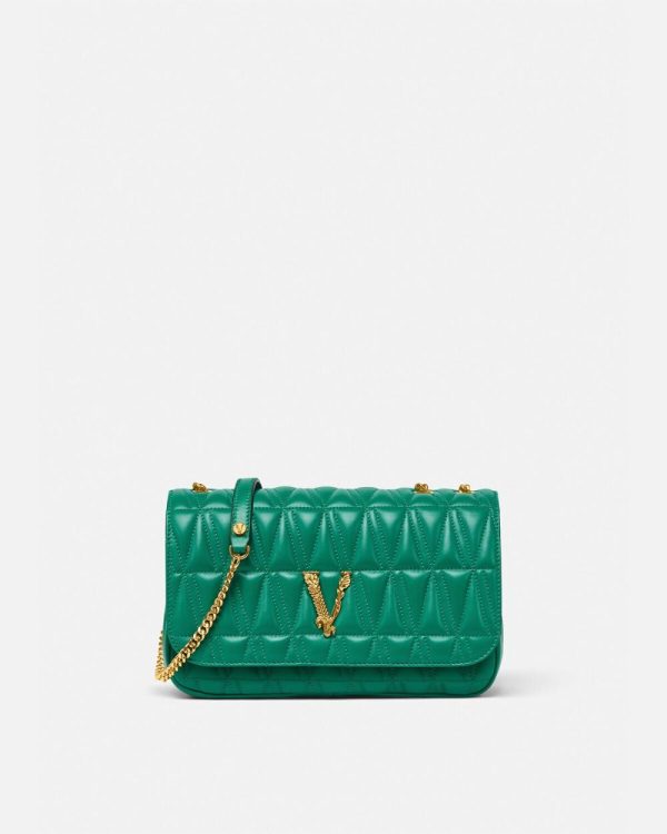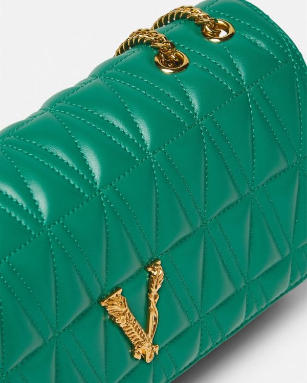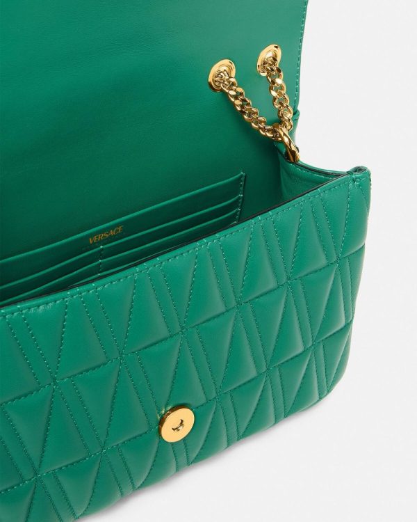 Crafted in Italian leather quilted in a V-pattern, the Virtus shoulder bag features a magnetic flap over closure, a shoulder chain and flat internal pockets. A bold symbol of the brand’s aesthetic heritage, the Barocco V hardware is embellished by acanthus leaves taken from Versace’s signature motif.