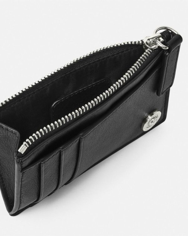 Crafted in Italy from premium leather, this zip-top card holder is adorned with a gold-tone Medusa hardware on the bottom corner.