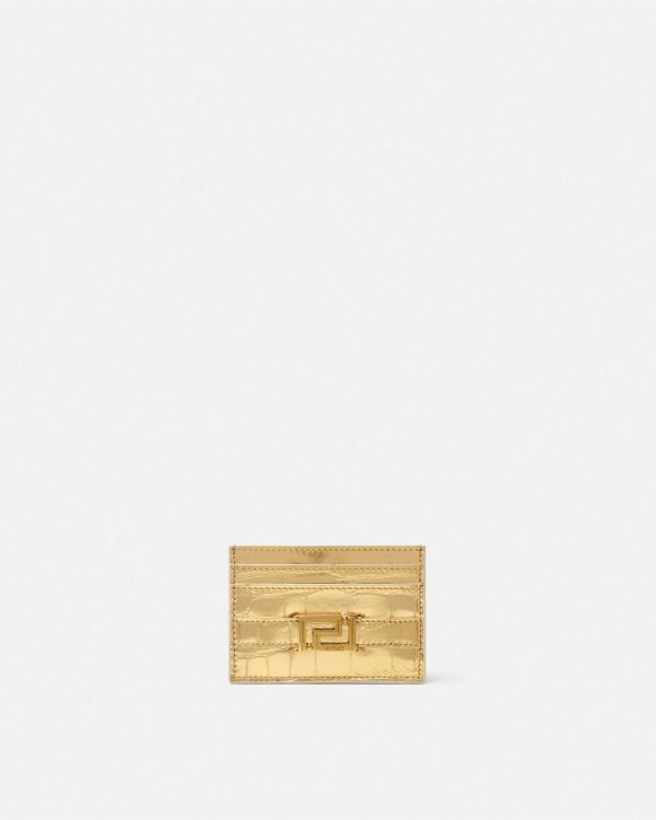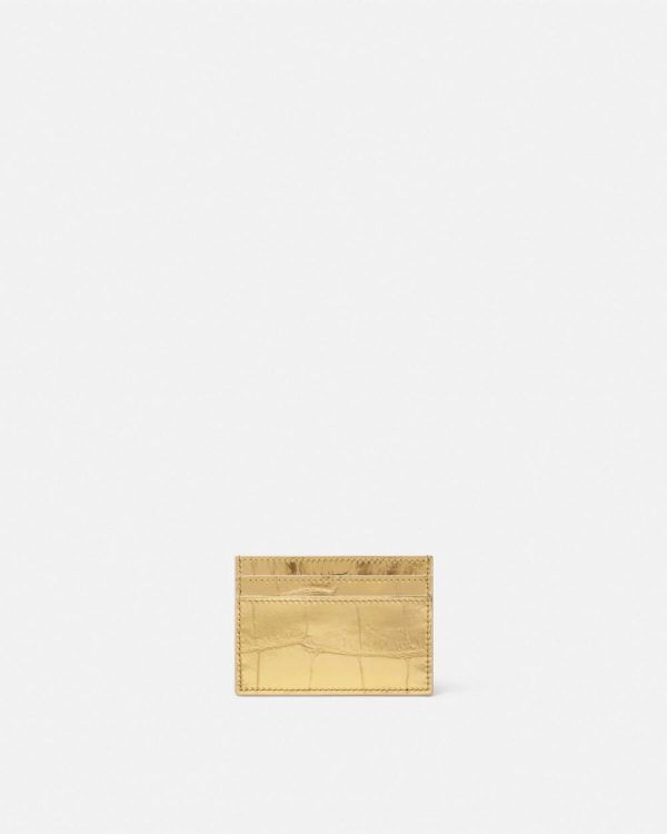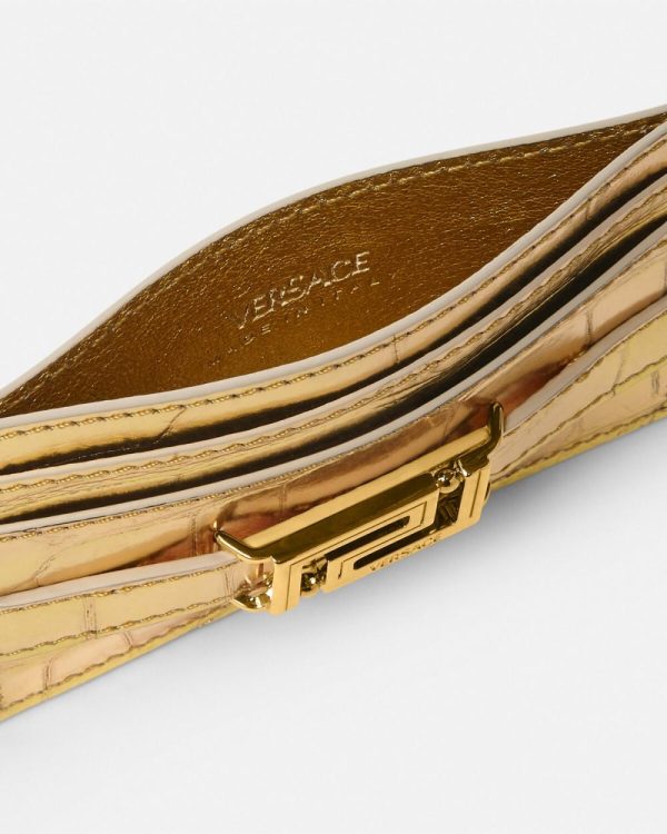 Crafted from croc-effect embossed leather in a metallic finish, this Greca Goddess card holder is accented by the Greca chain hardware with four card slots and a central slip compartment.