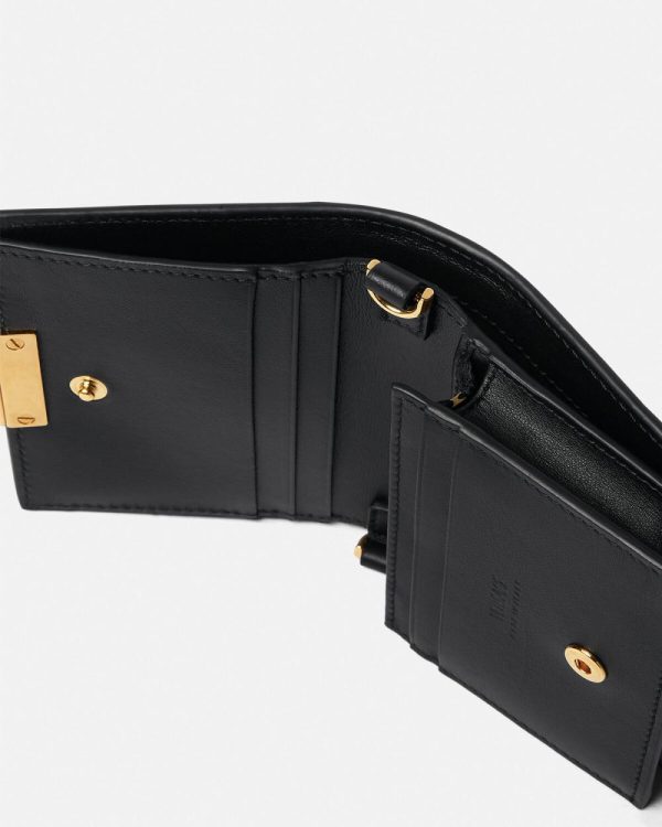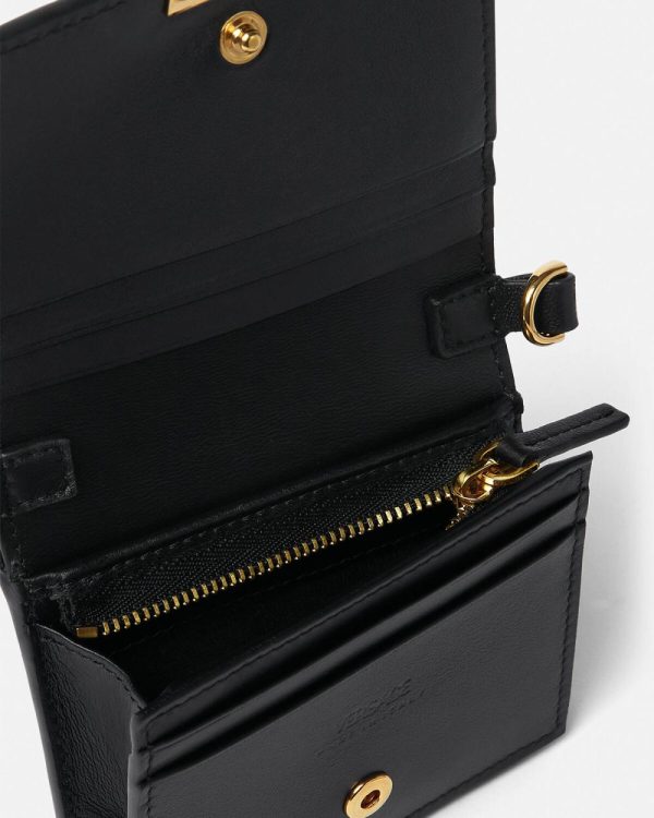 Crafted from leather, this Greca Goddess bifold wallet is accented by the Greca chain hardware with multiple internal card slots, a note compartment and coin pouch. The small accessory features a leather and Greca chain lanyard strap for neck or crossbody wear.