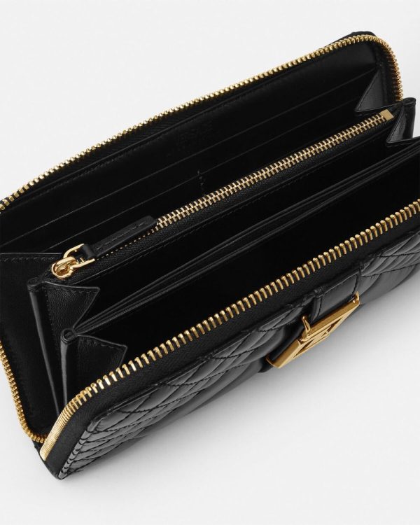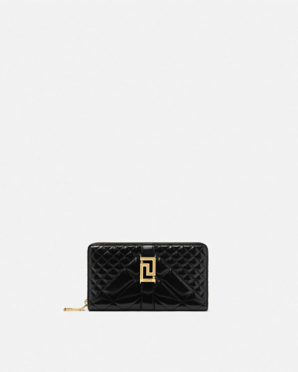 A continental wallet made from quilted smooth leather featuring the Greca chain hardware—a signature Versace symbol, constructed from one uninterrupted line. The long wallet features multiple card slots, note compartments, and a zipped pocket.