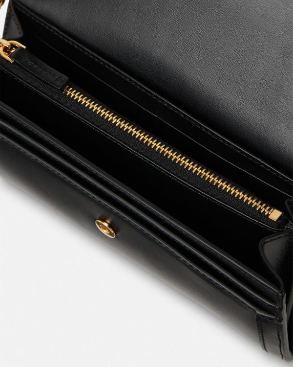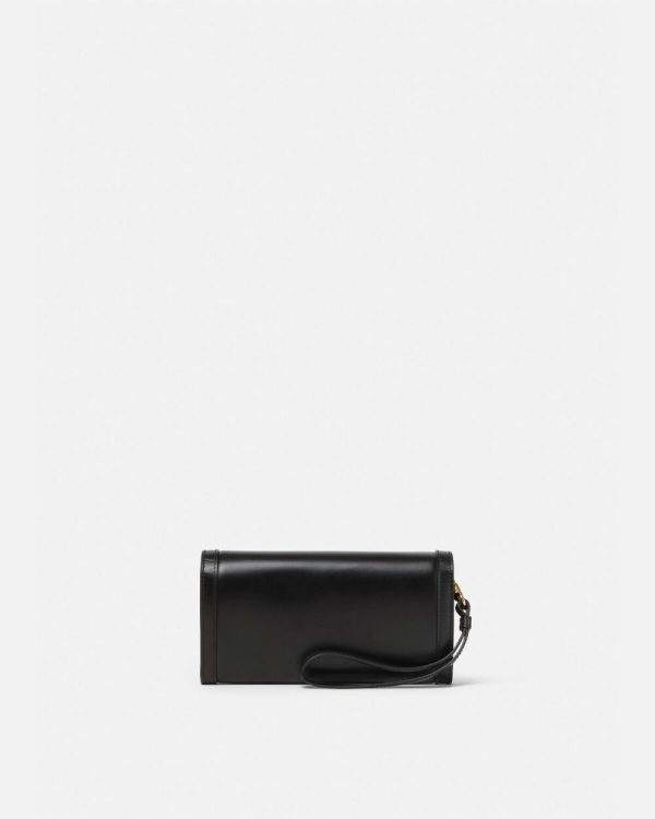 The Greca Goddess wallet is accented by the Greca chain hardware—a signature Versace symbol, constructed from one uninterrupted line. Crafted from smooth leather, the horizonal wallet features multiple card slots, note compartments and a detachable wrist strap.