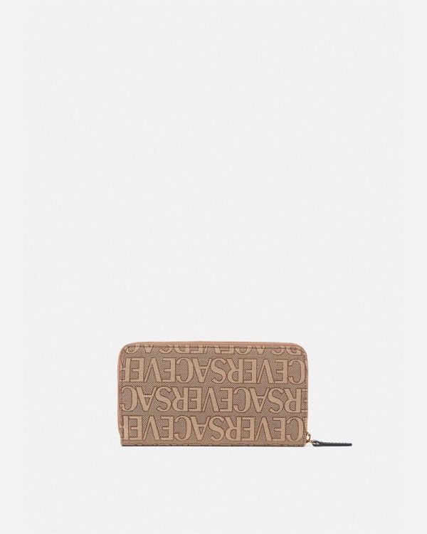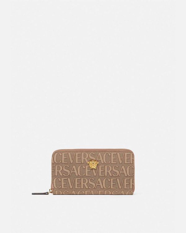 This continental wallet is crafted from a jacquard Versace Allover patterned canvas and is accented by the signature La Medusa hardware featuring a spacious interior with several card slots and a zipped coin pouch.