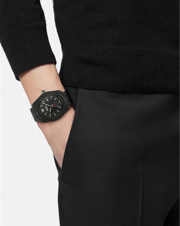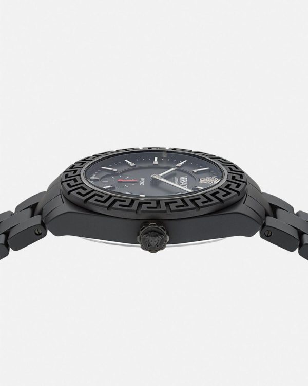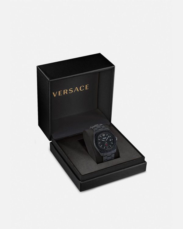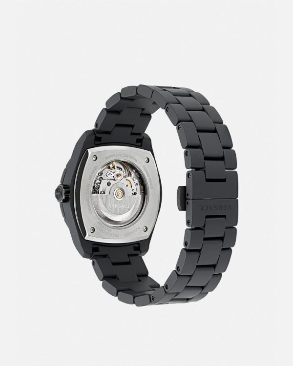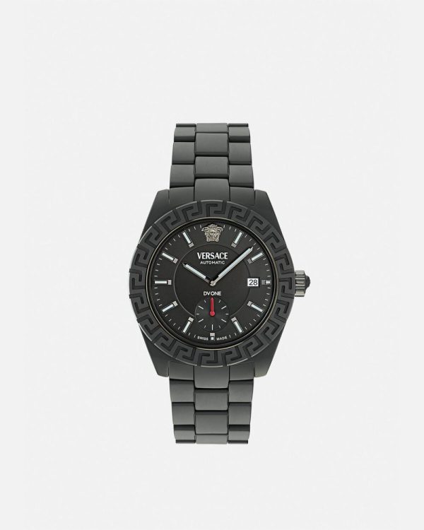 - Dial: Black enamel dial with Versace logo and Medusa at 12h; “DV One” inscription at 6h