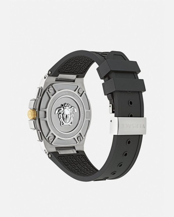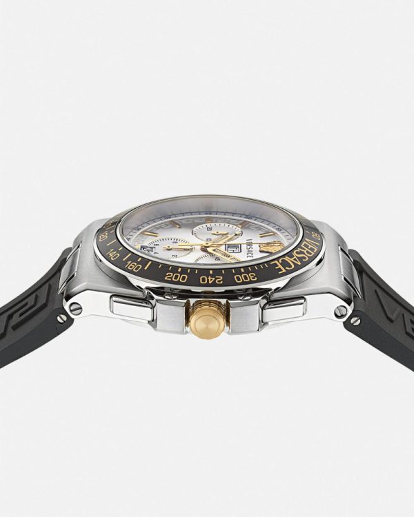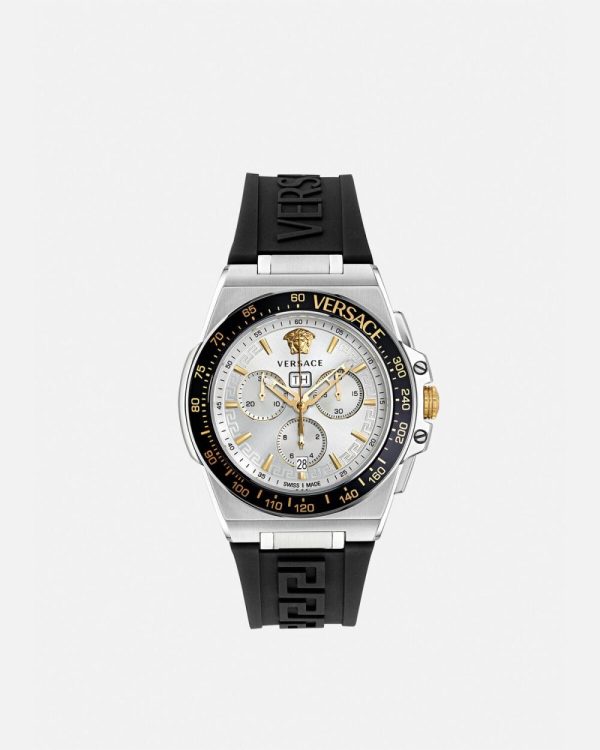 A chronograph watch featuring date and day indicators at 6h and 12h respectively. The dial is adorned by the iconic Greca motif, 3D Medusa, and Versace logo at 12h. The Versace logo is inserted in the tachymeter on the top ring. The timepiece is completed with a Greca embossed silicone band. All Versace watches are guaranteed by the ‘Swiss Made’ marking.
