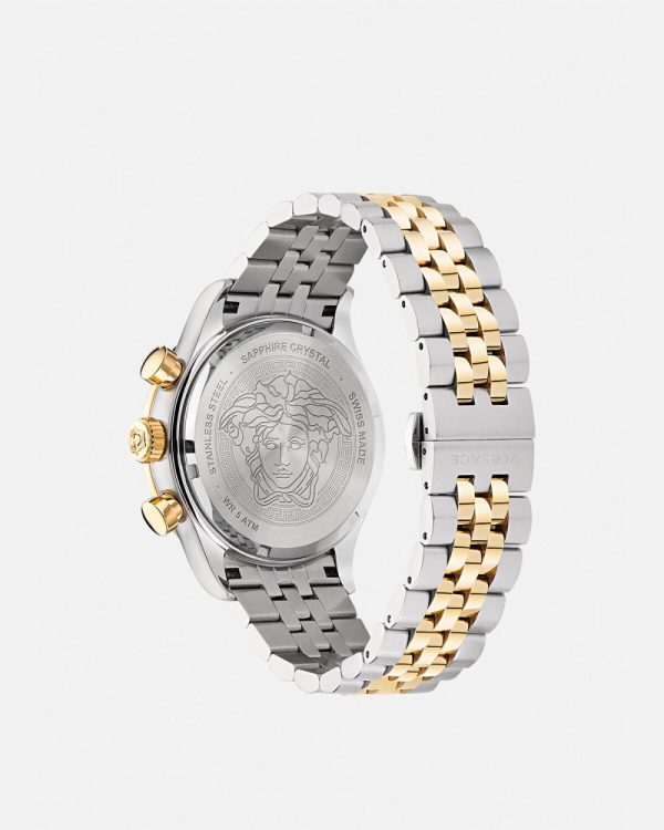 A contemporary reimagination , the Hellenyium Chrono takes inspiration from the original Hellenyium line. This sporty timepiece embellished with an emblematic, gold-tone Medusa and Greca accents. The watch features chronograph movement with three counters on the green dial with a champagne case. Finished with a stainless steel and champagne wristband.