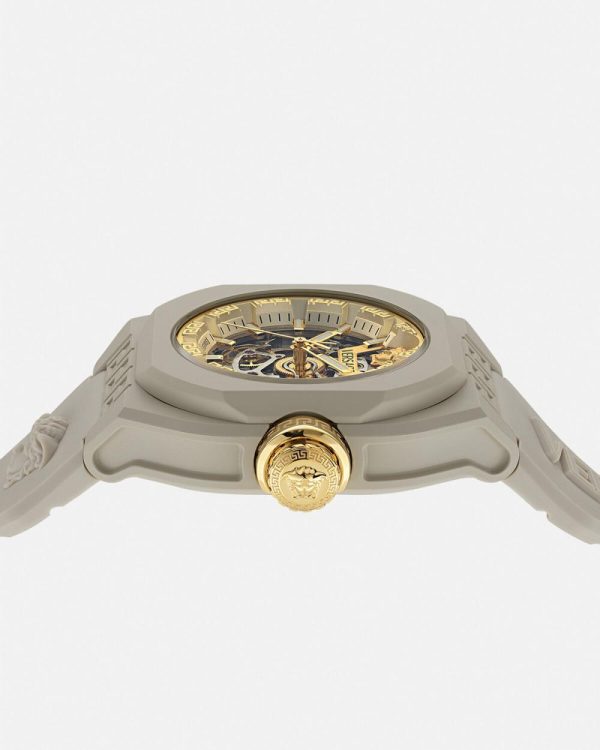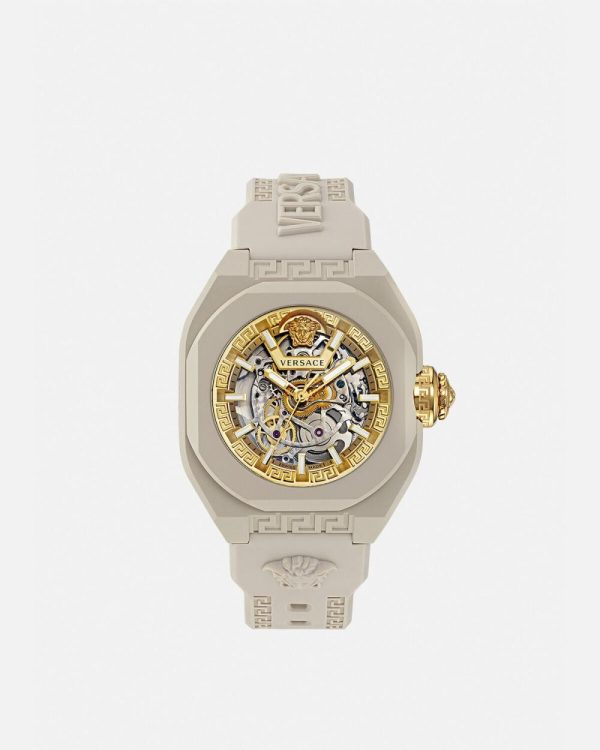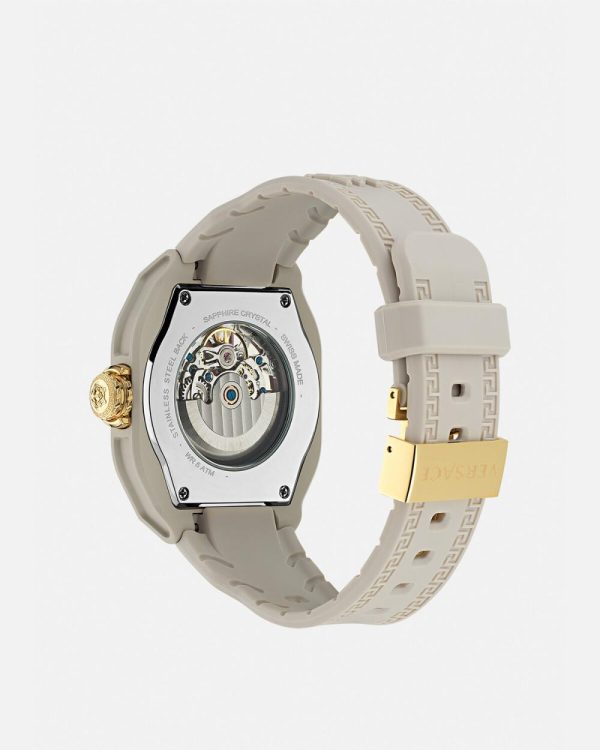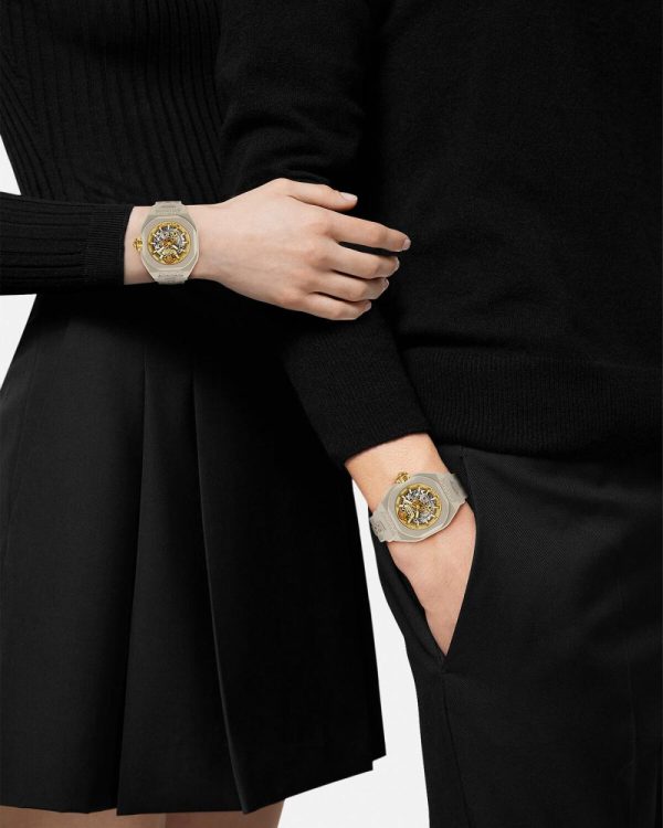 A futuristic timepiece with a stand-out automatic skeleton movement visible through the dial and see-through case back. The dial has the Versace logo and Greca, the strap features the 3D logo at 12h and the 3D Medusa at 6h, while the extra-large crown features an embossed Medusa and Greca motif. All Versace watches are guaranteed by the ‘Swiss Made’ marking.