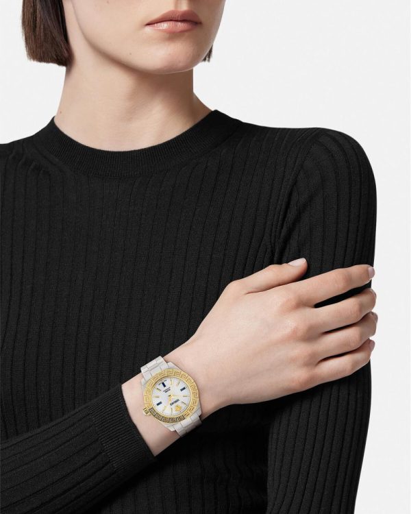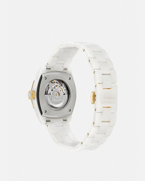 - Dial: White enamel dial with Versace logo and Medusa at 12h / DV One inscription at 6h / 2 Sapphires at 6h and 9h