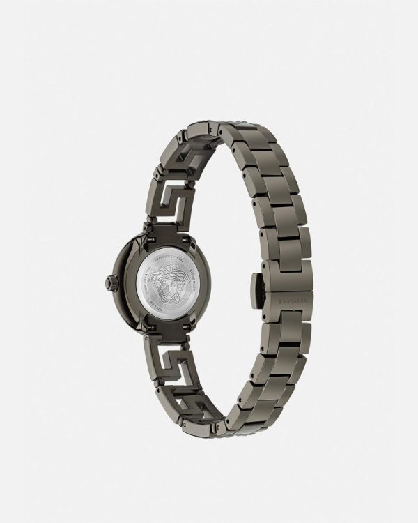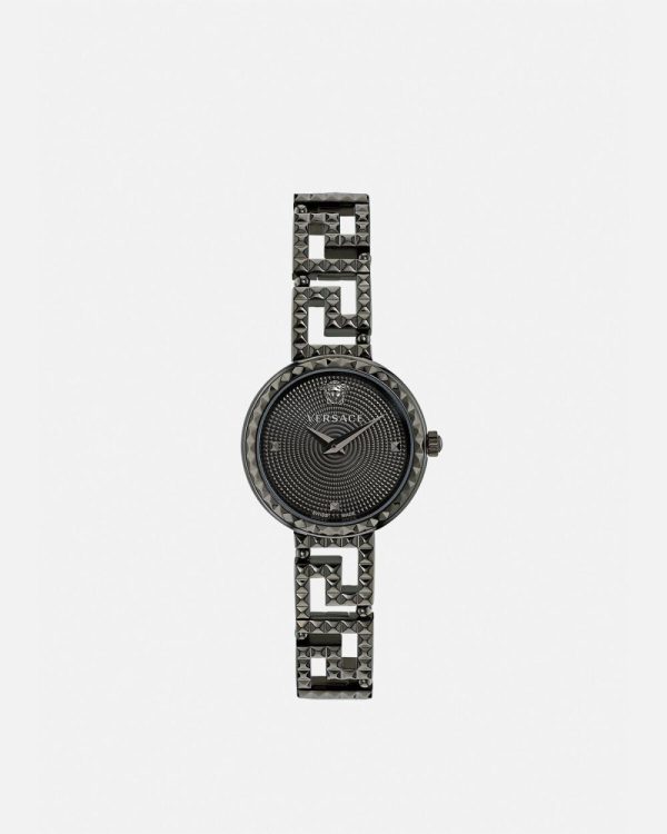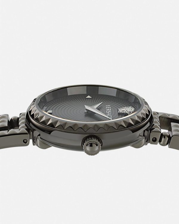 - Dial: Black dial with Versace logo and Medusa at 12h / Stud indexes at 3h, 6h, and 9h