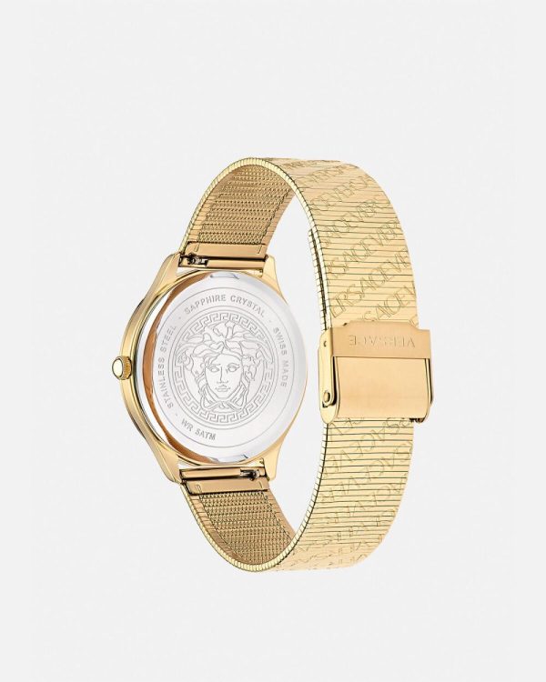 This timepiece features a ring of the ‘Versace Versace Logomania’ on a black dial with gold-tone details. The versatile design is enhanced with a slim champagne case and metal mesh wristband embossed with the Versace logo.
