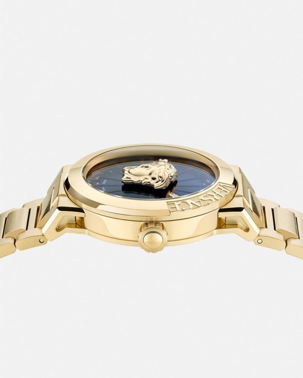This elegant timepiece features a three-dimensional Medusa set between two crystals with a two-hands movement system. A lug Greca pattern features on the inner dial, while an engraved Versace lettering at the ring frames the case. The accessory is finished with a metal band.