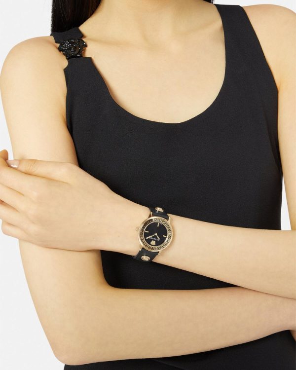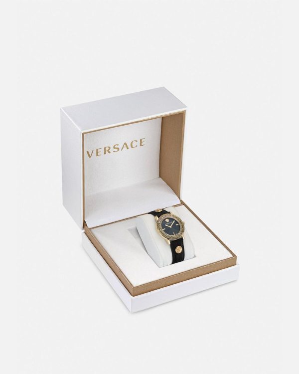 A contemporary timepiece combining geometric shapes and feminine style, this V-Tribute watch features champagne case embossed with a black Greca motif and matching dial. Instantly recognizable by the gold-tone Medusa plaque at the 12 o’clock position and the two Medusa studs on the black leather band.